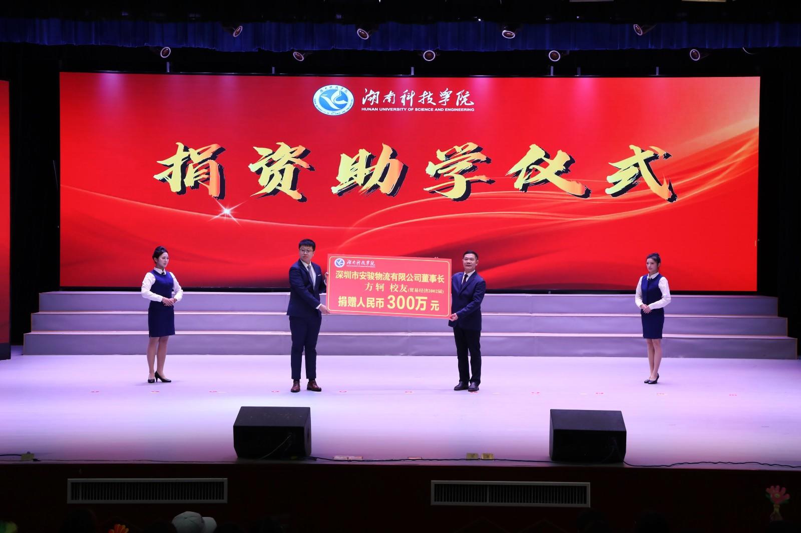 活动现场,该校经济与管理学院2002届优秀校友、深圳市安骏物流有限公司董事长方轲捐赠300万元设立助学金,远在巴西的方轲还通过视频表达了对母校的感恩之情,和助力母校教育事业发展的心愿。