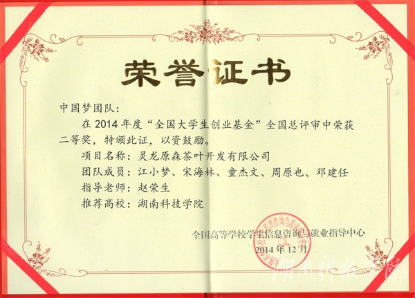 全国大学生创业基金总评审由全国高等学校学生信息咨询与就业指导中心主办,吸引了全国31个省市、951所高校申报的2251个大学生创业项目申报。历经网络海选、华中、华南、华东、西部、北部五个分赛区评审以及总评审角逐,最终评审出一等奖3项、二等奖8项、三等奖19项、优秀奖30项。买球官网外语系2011级学生江小梦负责的“灵龙原森茶叶开发有限公司”在历经层层选拔后进入总评审前5名,成为湖南省在本届评审中唯一受资助的项目。