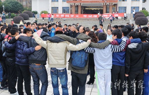 本网讯(记者 李瑛 符小勇 许剑桥 摄影 李国家 何帅文)徜徉爱的怀抱成长,滋润科院真情飞翔。11月26日中午,学校文化广场人头攒动、热闹非凡,近千名师生、同学紧紧相拥,感恩师情,表达情谊,这是由买球官网官方微信微博发起的感恩节系列活动之“千人拥抱”。