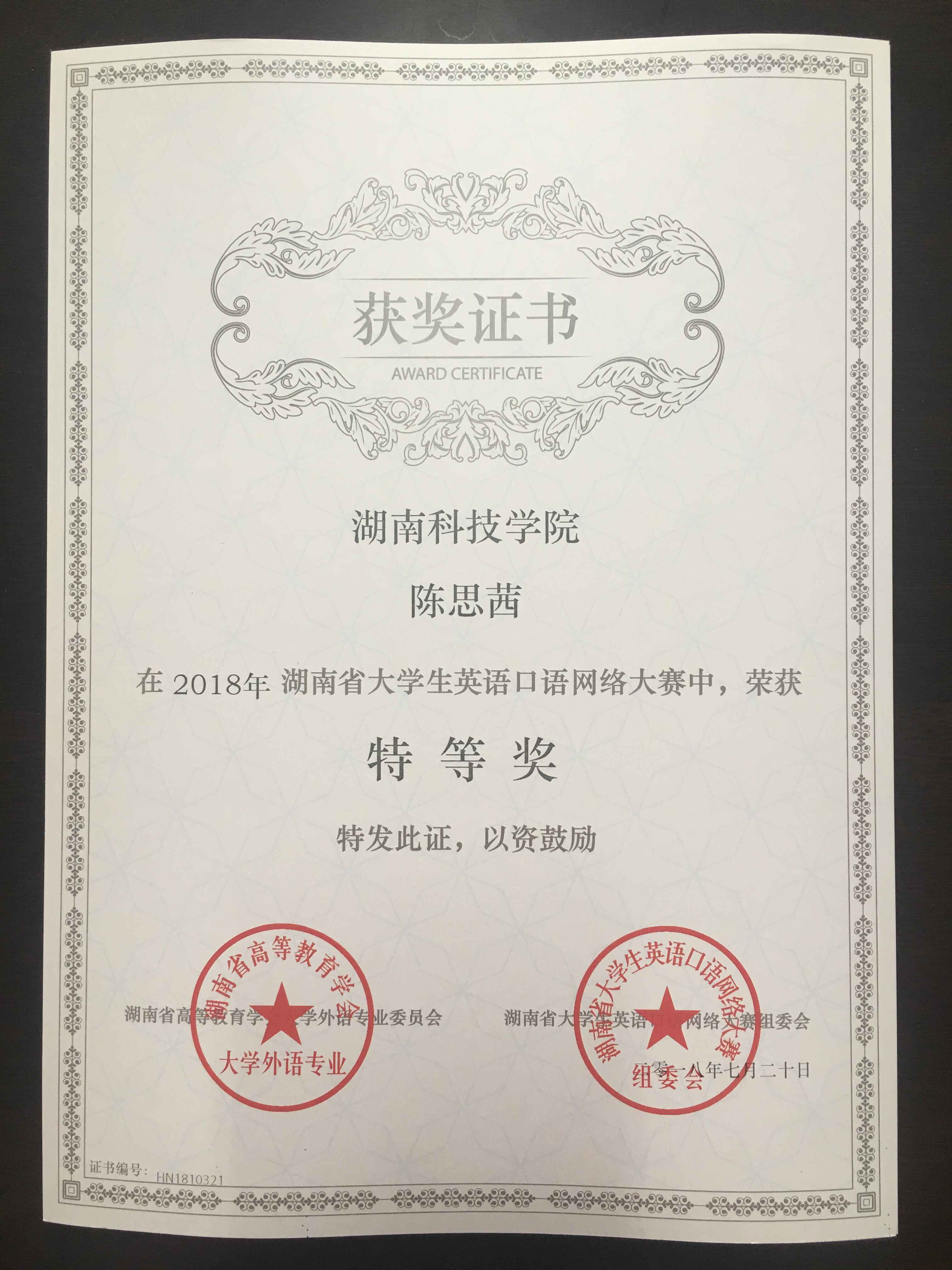 本网讯 在湖南省首届英语口语网络大赛中,买球官网英语1504班陈思茜从决赛选手中脱颖而出,以第二名的成绩获得省特等奖。据悉,本次决赛共有来自全省三十九所高校的一百多名选手参加。 陈思茜同学非常刻苦,每天坚持在“FIF口语训练”APP上挑战时长为8分钟的赛题,一次次地刷新自己的记录,经200多分钟的反复挑战,最终获得97分的高分,荣获省特等奖。
